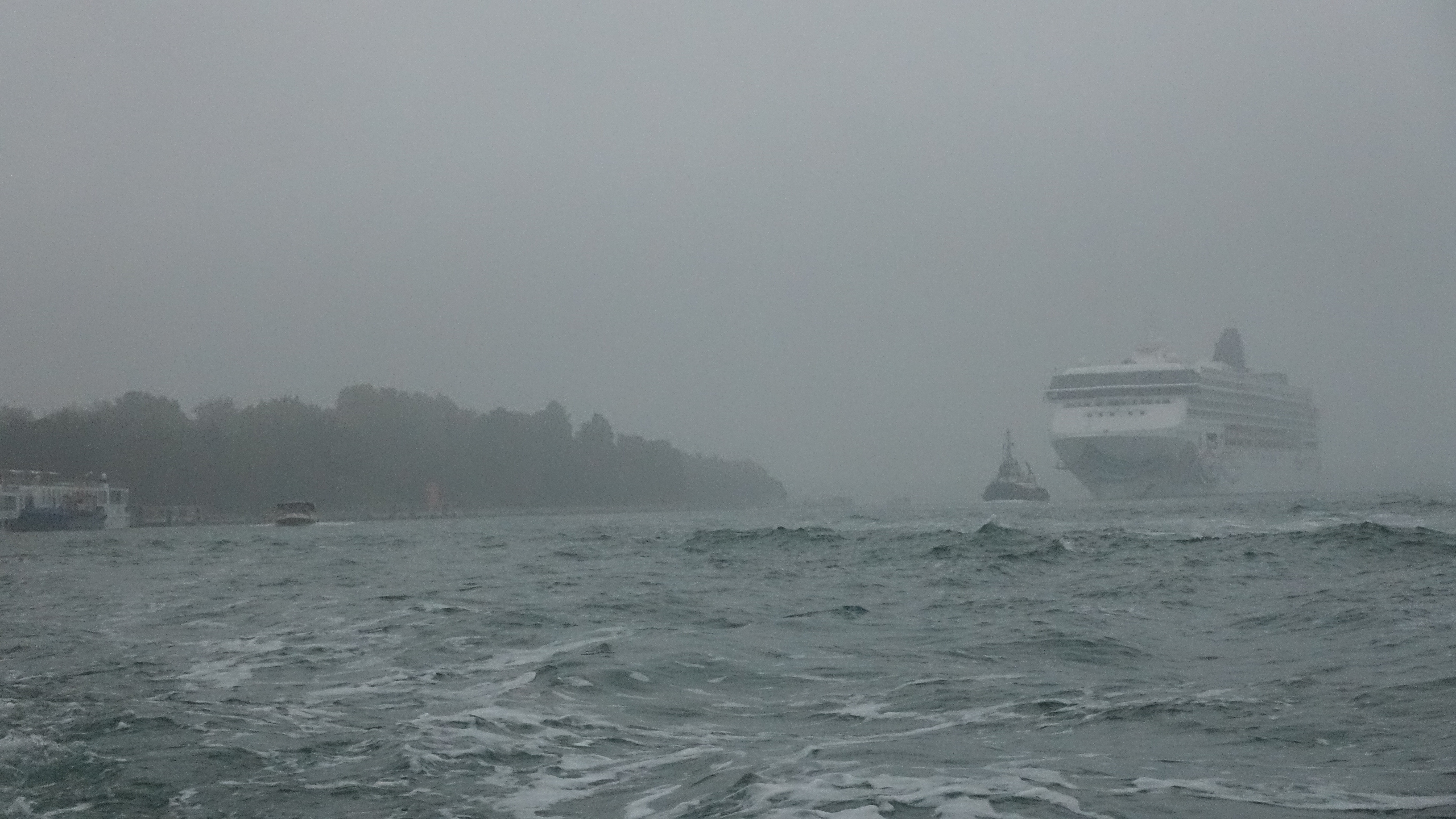 Not much else to see really, so I headed back to the VapStop and hopped the first boat out. Lucky me this one was taking me along a part of the Grand Canal I had not see yet. as we went along a big, big, white cruise ship punched through the fog and into view, towed by a brave little tug boat. Venezia is no longer a trade center, but it is still a major seaport. The tourist industry is huge and Venezia is a major stop. 1300 years of history and culture will sure get people in the door, and opening their wallets.