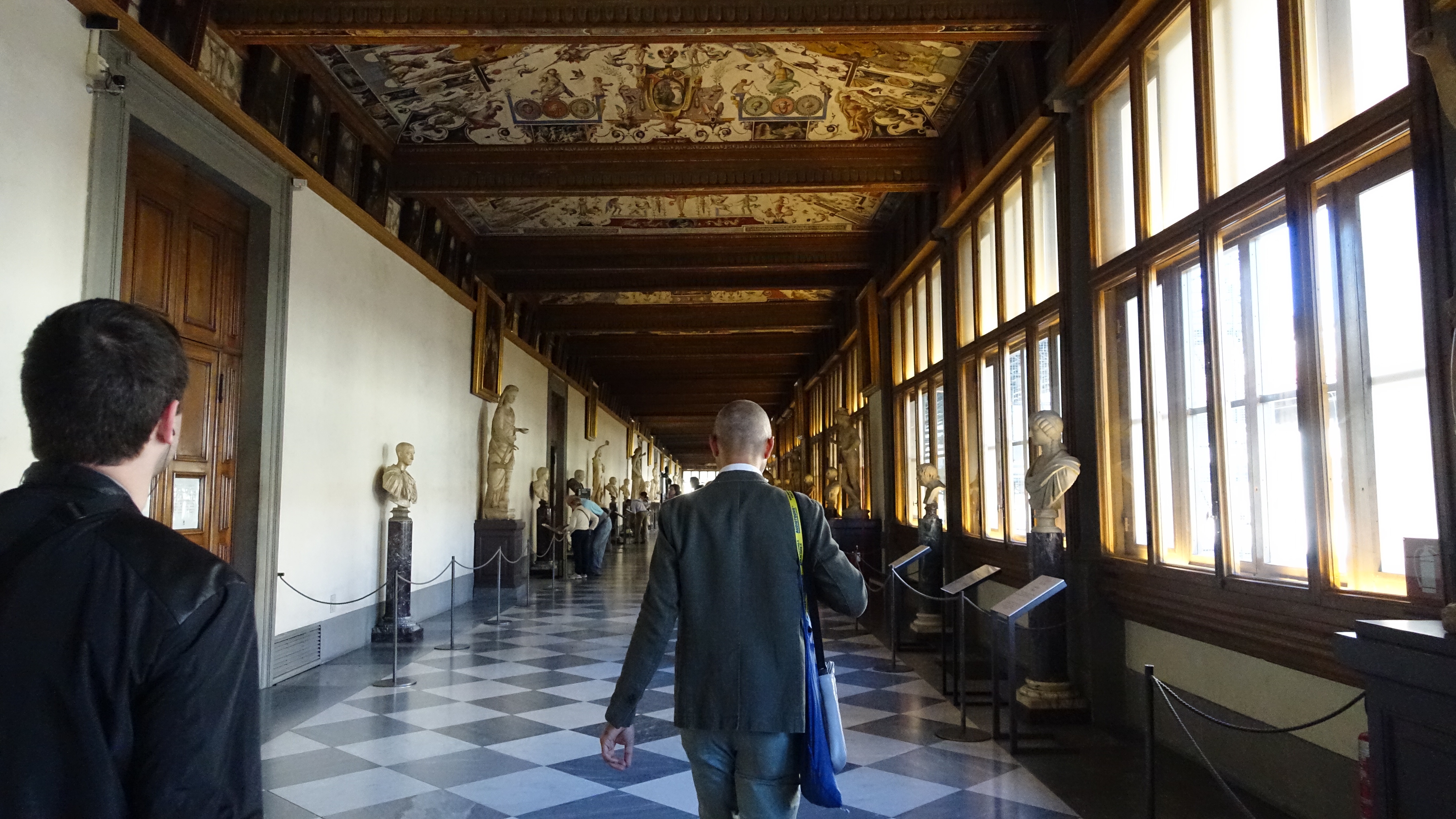 Past the Ponte Vecchio on the left is a long wide plaza and the entrance to the Uffizi. There are two entrances actually, one for those who bought advance tickets, or are on a tour, and one for the rest of the world. I had considered a tour but figured I would just take my chances. bad choice. The line was long and it wasn’t moving. Way up ahead I could spot a steady stream of tour groups and advance ticket holders entering this historic place. The rest of us just stood. I was considering a Plan B, When a female voice in lilting, Italian accented English called out,
