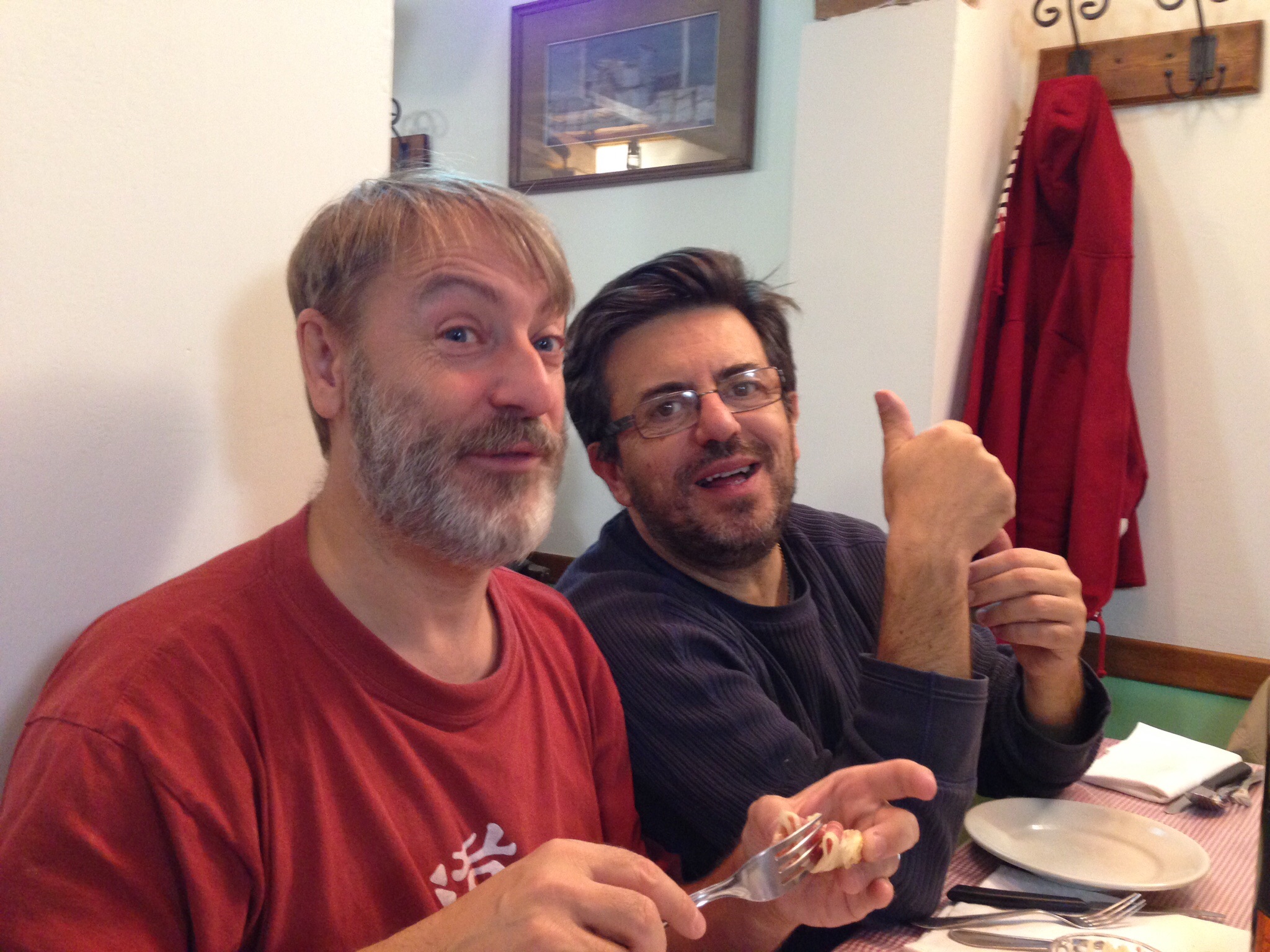 animated dinner at Trattoria Sabbatino in the shadow of the remains of the wall that had been erected to protect Florence from invaders in the 15th century. More wine was consumed along with Papardelle pasta with rabbit, Florentine tripe, and a perfectly ripe persimmon for dessert. A dessert wine called Vino Santo was served along with biscotti, which are to be dunked in the wine and enjoyed. Vino Santo is sacramental wine and dipping a biscotti in it is a sort of reminder of the sacrament of communion. and it tastes good too.