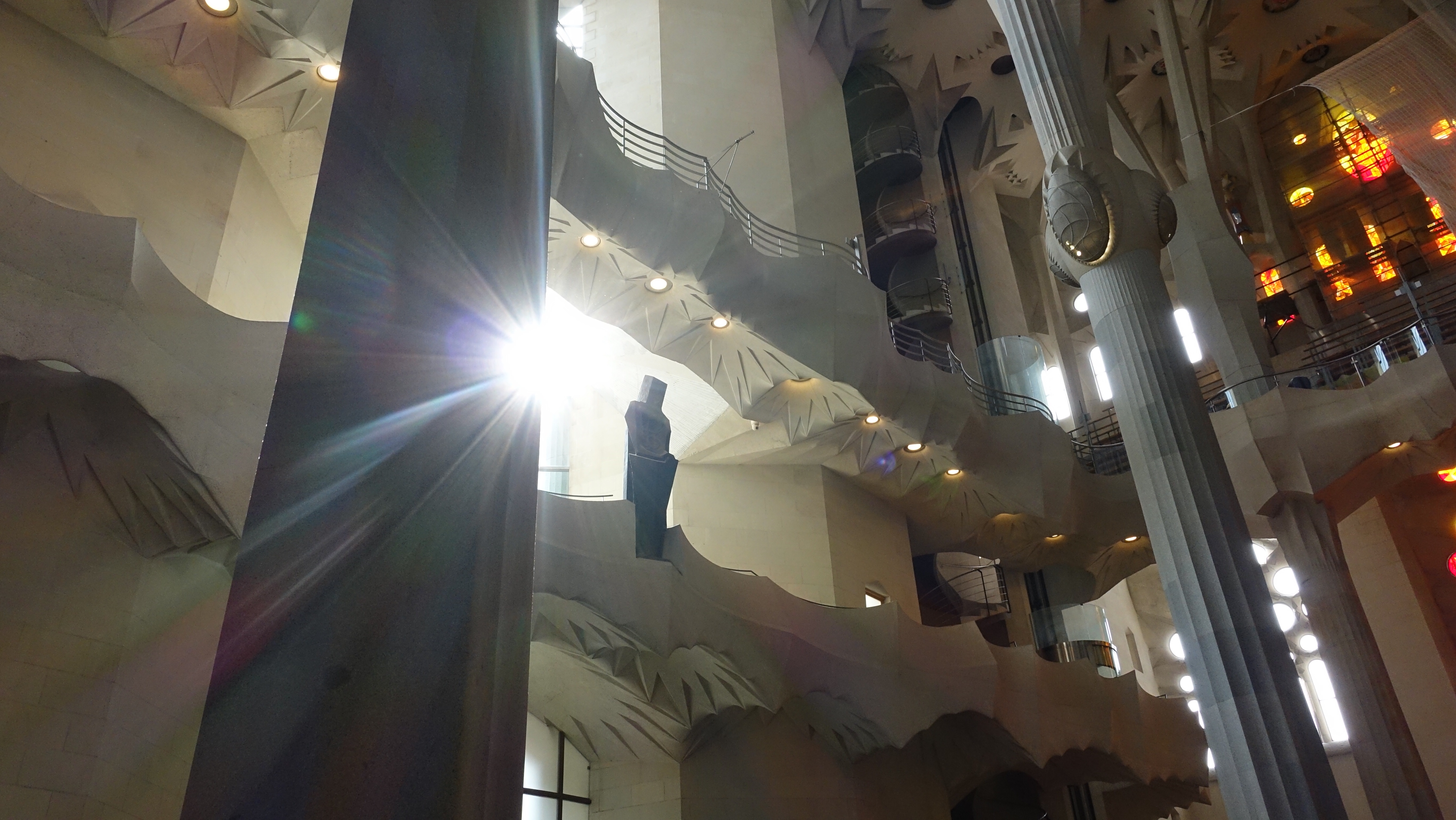 Someone born without the sense of hearing, when seeing the interior of Sagrada Familia, would finally understand the concept of a “choir of angels”. The soaring columns of different shapes and types of stone branch apart near the high, high, ceiling like trees. The light streaming Coming in through the multicolored stained glass windows is modulated and soft throughout, and unfiltered and hard In the places Gaudi wants to draw attention, especially the area high above the altar where a circular window literally lets in light from heaven.